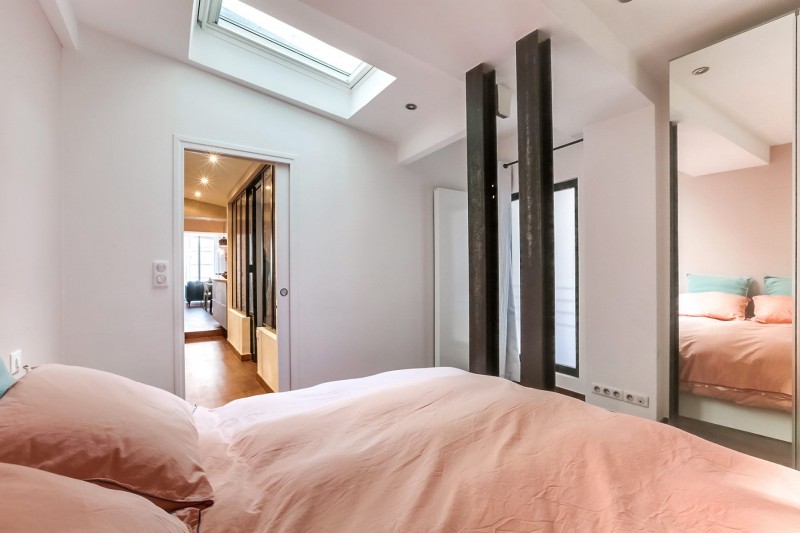 Appartement de 70 m2, occupant un ancien atelier composé de 3 volumes traversants. L’appartement a été entièrement refait. La cuisine a été placée de façon à liaisonner les volumes entre eux dans l’espace disposant de moins de lumière naturelle. Les cloisons en serrurerie gardent au lieu son style atelier. Des rangements en miroirs élargissent visuellement les circulations. Les sols ont été réalisés en parquet massif teinté. Le grand mur du salon a été habillé de pierres plaquées jusqu’au couloir toujours dans la finalité de visualiser de grandes perspectives.