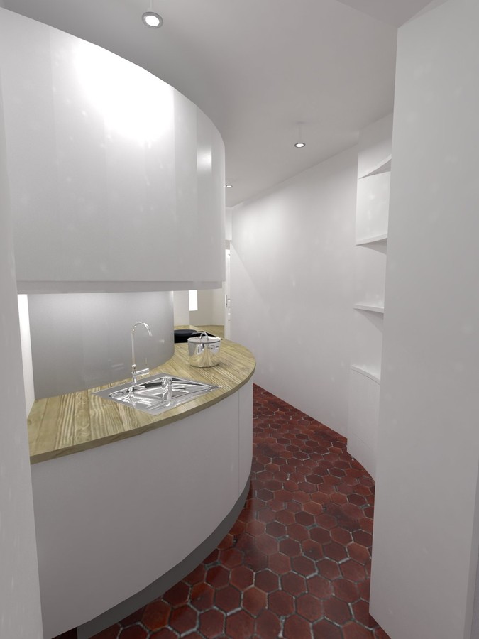 Appartement de 75 m2, traversant, en étage, composé d’un espace de vie séparé des chambres et salles de bains par un patio vitré. L’appartement a été entièrement refait. La cuisine d’origine se situait à la place d’une des chambres, j’ai installé la nouvelle cuisine autour du patio, ouverte sur le salon salle à manger. Les fenêtres du salon donnent sur la Seine, dès l’entrée la vue sur Notre Dame est découverte. Les courbes du faux plafond accompagne l’espace cuisine et permettent d’avoir un éclairage différencié du reste de l’appartement. Les sols en parquet à panneau ont été poncés et vitrifiés en vernis mat. Les sols des chambres et dégagements ont été réalisés en béton ciré.