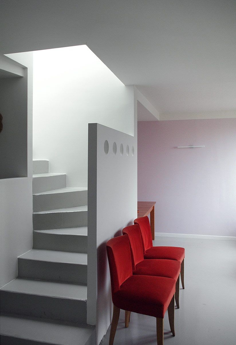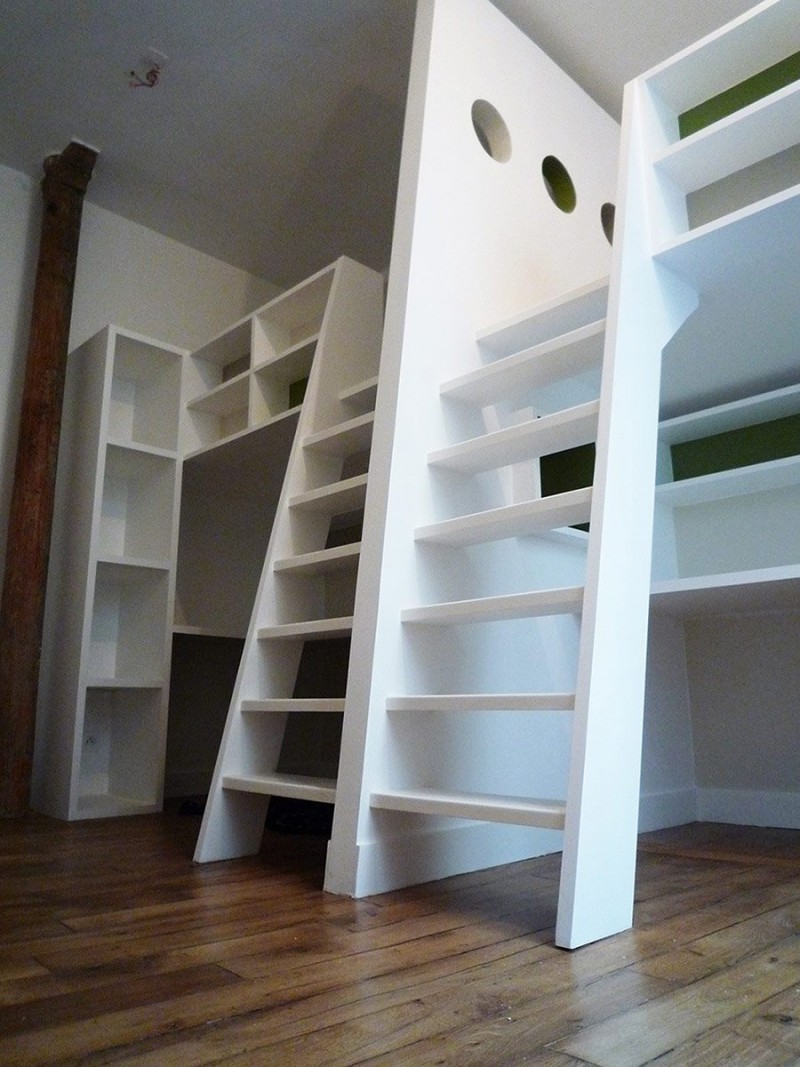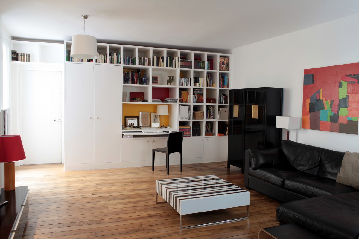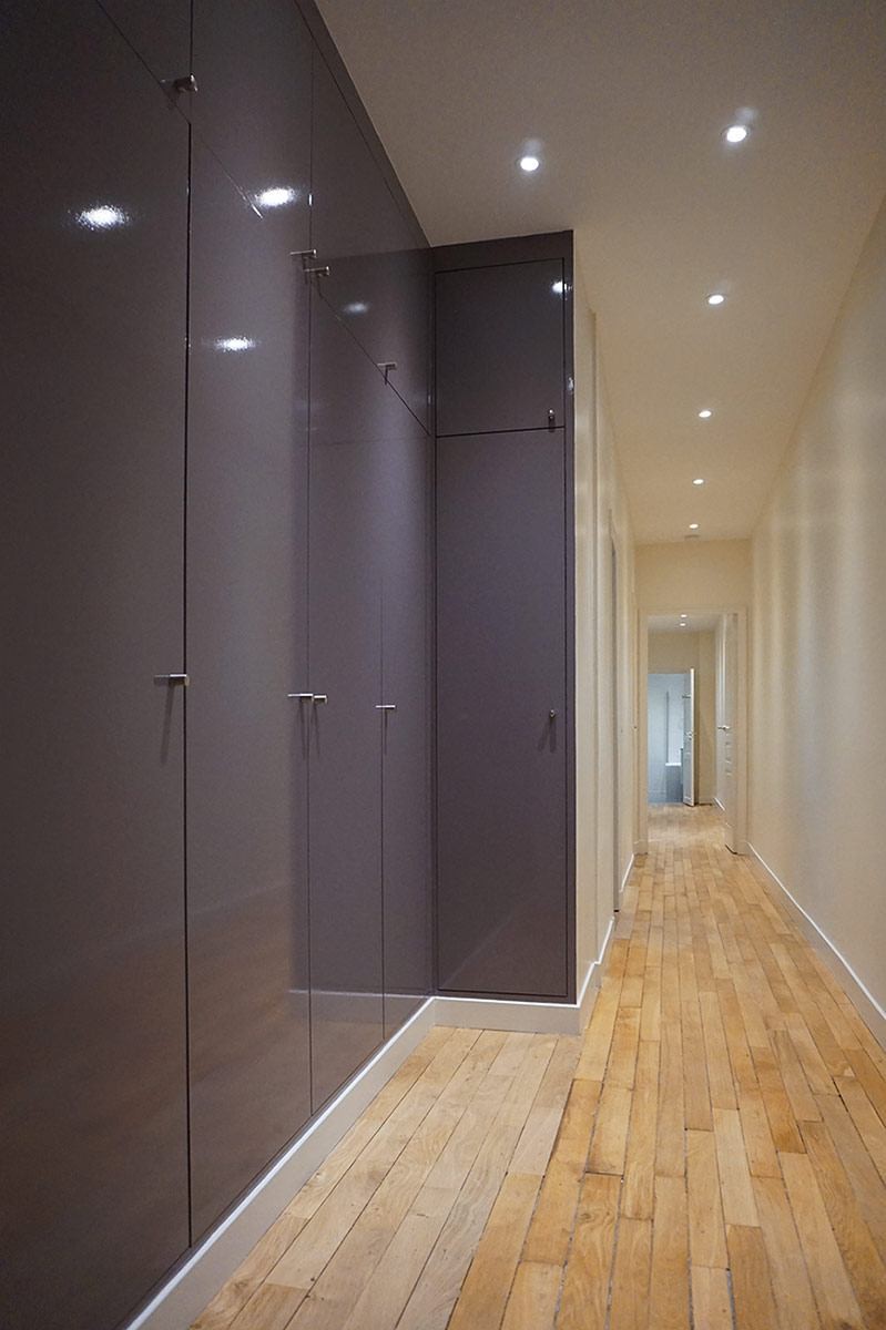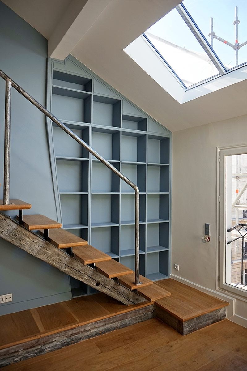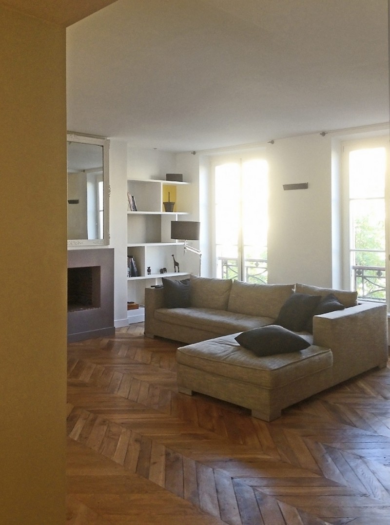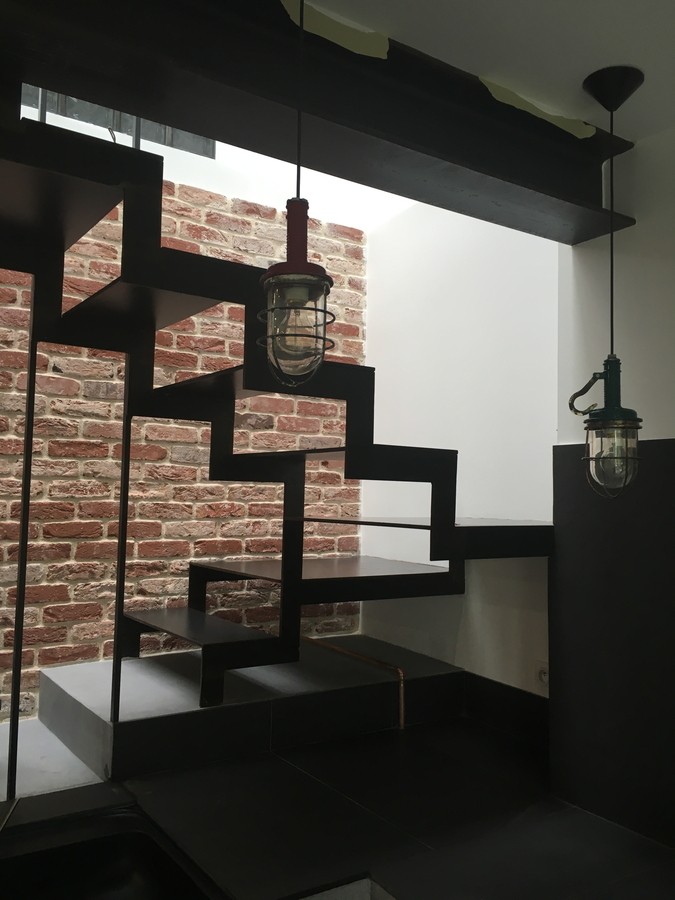 Appartement de 70 m2, occupant un ancien atelier composé de 3 volumes traversants. L’appartement a été entièrement refait. La cuisine a été placée de façon à liaisonner les volumes entre eux dans l’espace disposant de moins de lumière naturelle. Les cloisons en serrurerie gardent au lieu son style atelier. Des rangements en miroirs élargissent visuellement les circulations. Les sols ont été réalisés en parquet massif teinté. Le grand mur du salon a été habillé de pierres plaquées jusqu’au couloir toujours dans la finalité de visualiser de grandes perspectives.