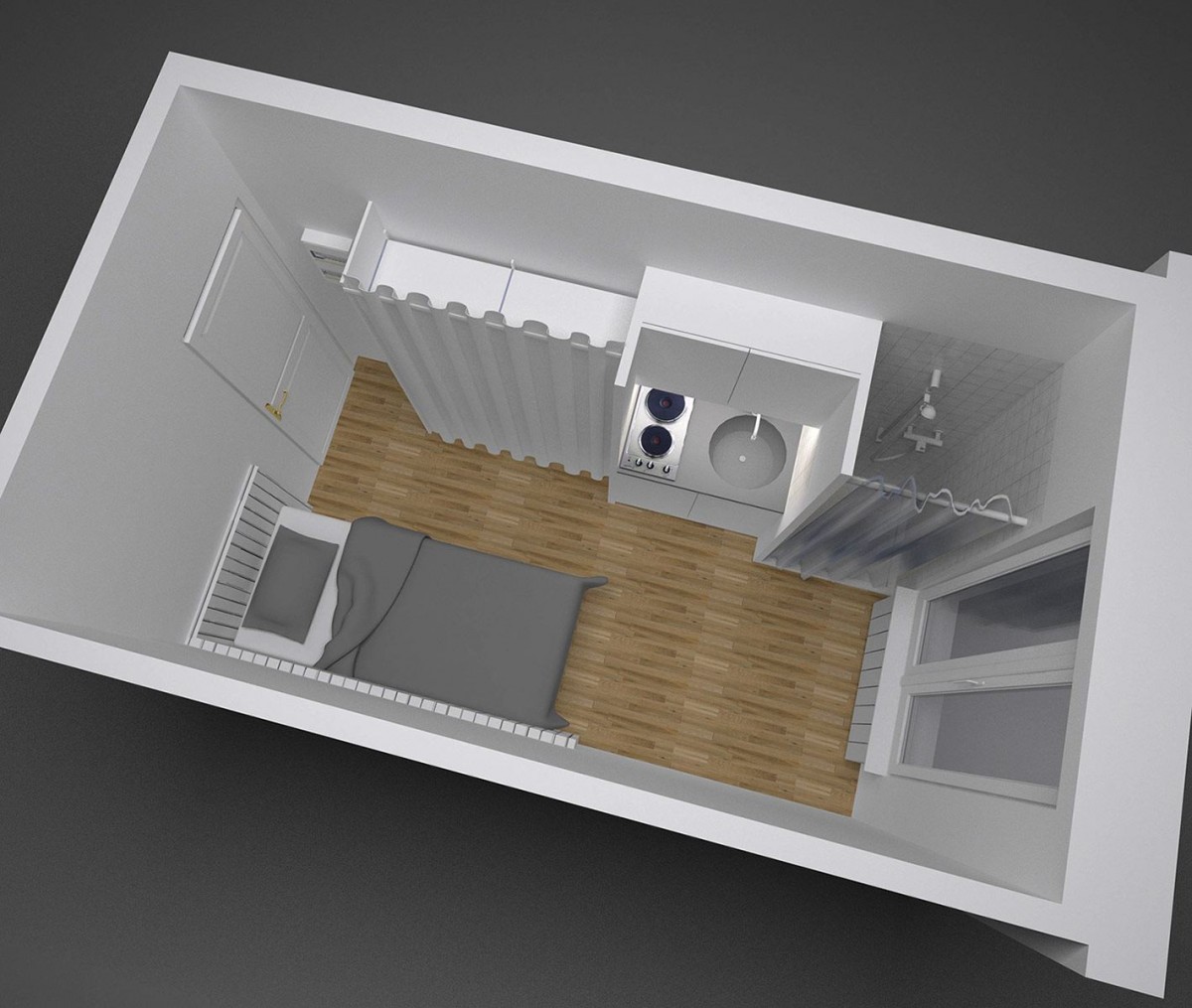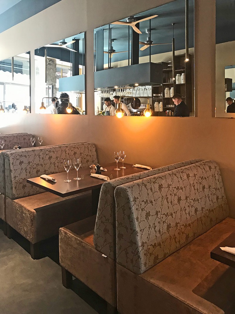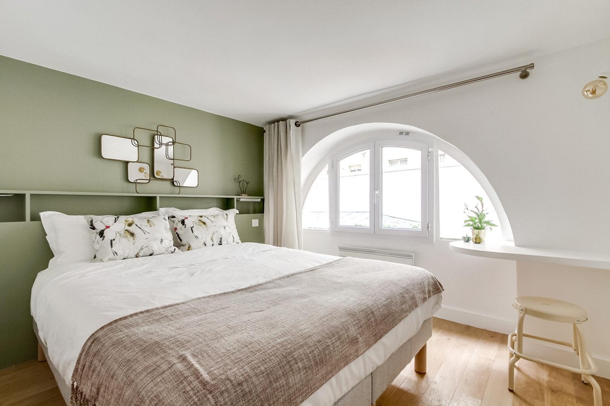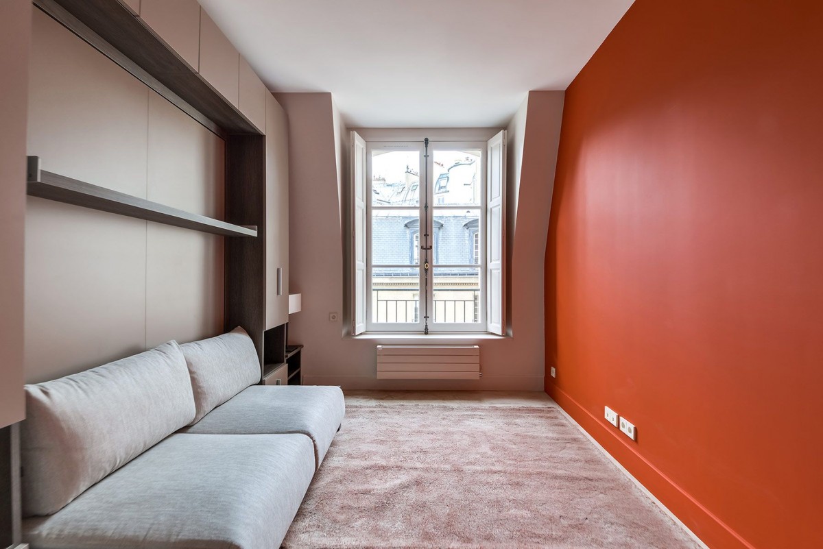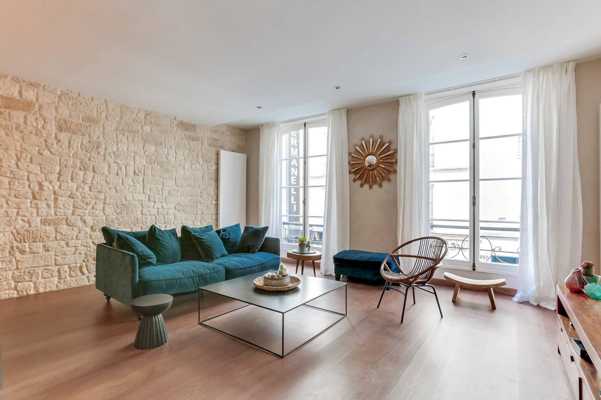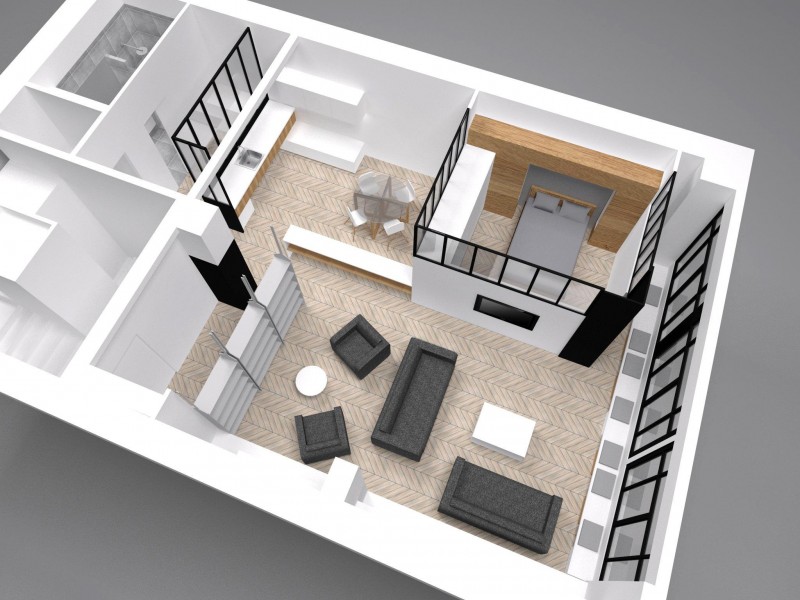 Appartement de 70 m2, occupant un ancien atelier composé de 3 volumes traversants. L’appartement a été entièrement refait. La cuisine a été placée de façon à liaisonner les volumes entre eux dans l’espace disposant de moins de lumière naturelle. Les cloisons en serrurerie gardent au lieu son style atelier. Des rangements en miroirs élargissent visuellement les circulations. Les sols ont été réalisés en parquet massif teinté. Le grand mur du salon a été habillé de pierres plaquées jusqu’au couloir toujours dans la finalité de visualiser de grandes perspectives.