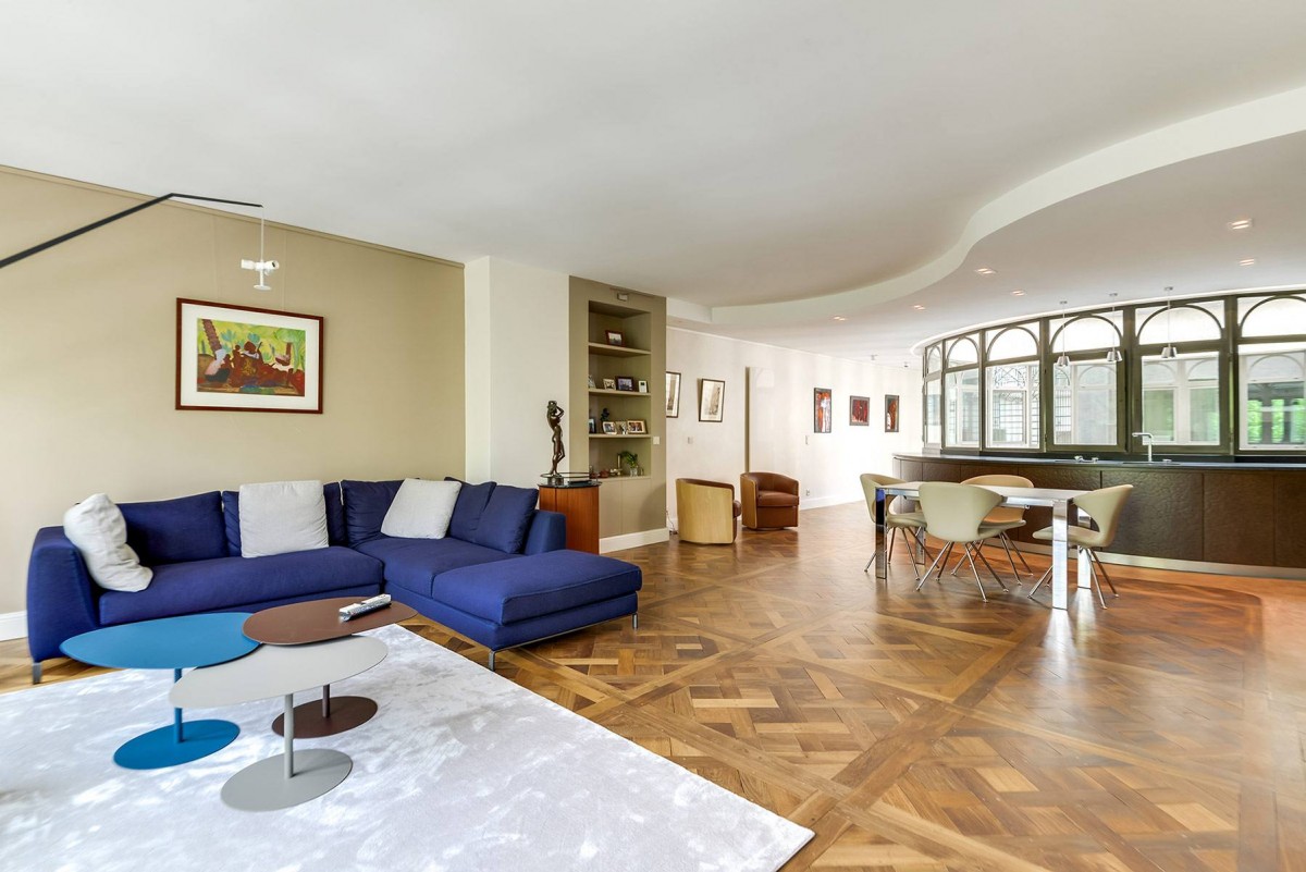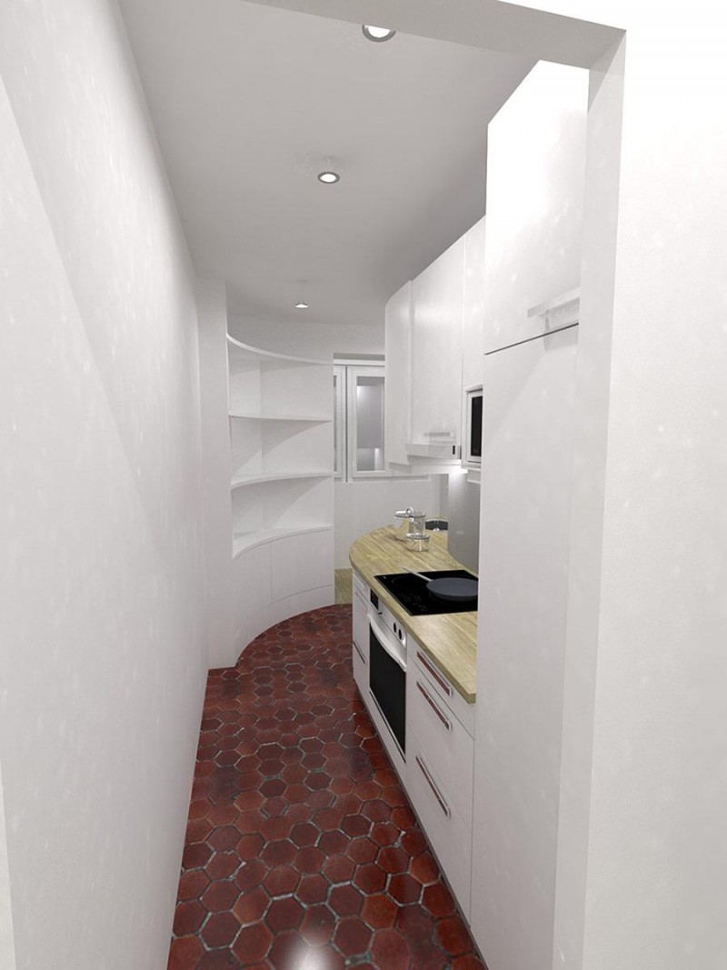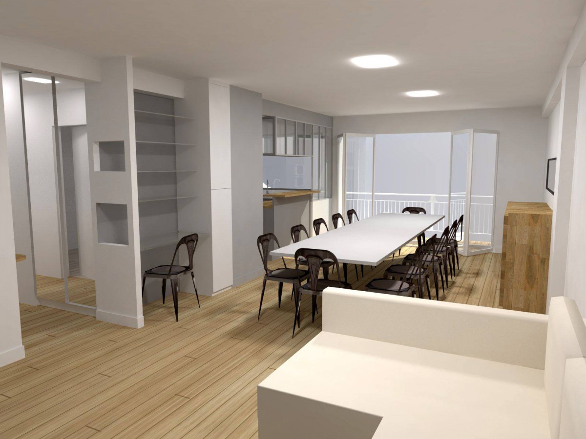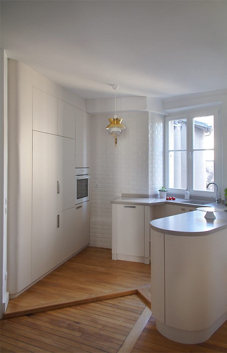Appartement de 75 m2, traversant, en étage, composé d’un espace de vie séparé des chambres et salles de bains par un patio vitré. L’appartement a été entièrement refait. La cuisine d’origine se situait à la place d’une des chambres, j’ai installé la nouvelle cuisine autour du patio, ouverte sur le salon salle à manger. Les fenêtres du salon donnent sur la Seine, dès l’entrée la vue sur Notre Dame est découverte. Les courbes du faux plafond accompagne l’espace cuisine et permettent d’avoir un éclairage différencié du reste de l’appartement. Les sols en parquet à panneau ont été poncés et vitrifiés en vernis mat. Les sols des chambres et dégagements ont été réalisés en béton ciré.