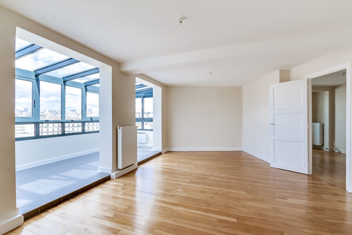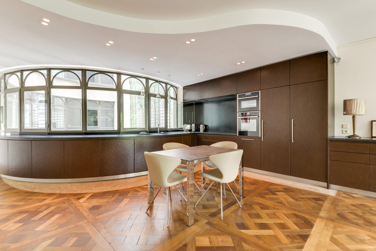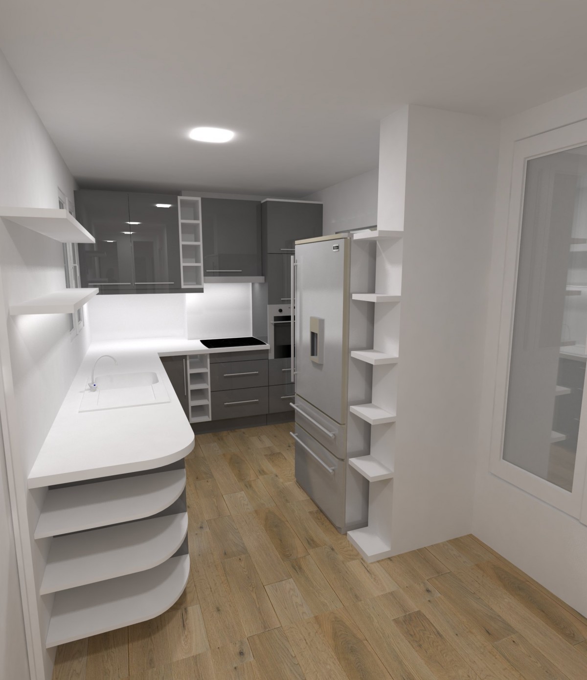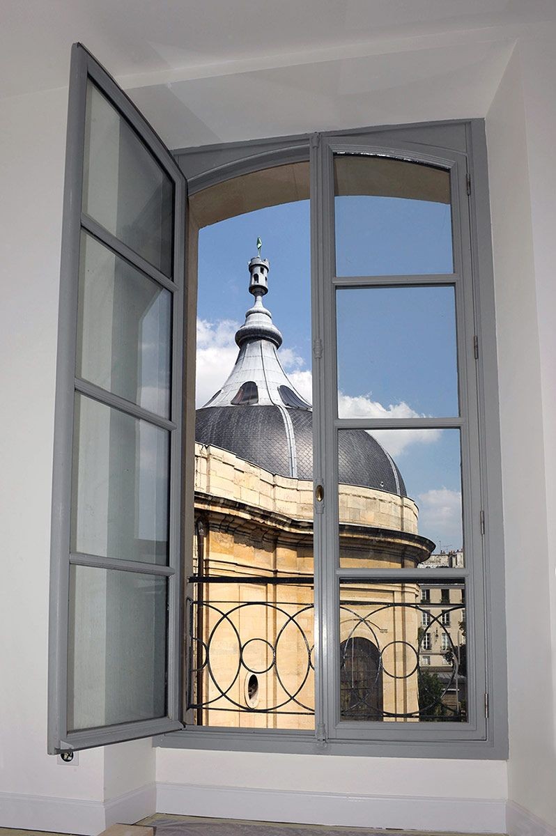Appartement de 75 m2, traversant, en étage, composé d’un espace de vie séparé des chambres et salles de bains par un patio vitré. L’appartement a été entièrement refait. La cuisine d’origine se situait à la place d’une des chambres, j’ai installé la nouvelle cuisine autour du patio, ouverte sur le salon salle à manger. Les fenêtres du salon donnent sur la Seine, dès l’entrée la vue sur Notre Dame est découverte. Les courbes du faux plafond accompagne l’espace cuisine et permettent d’avoir un éclairage différencié du reste de l’appartement. Les sols en parquet à panneau ont été poncés et vitrifiés en vernis mat. Les sols des chambres et dégagements ont été réalisés en béton ciré.